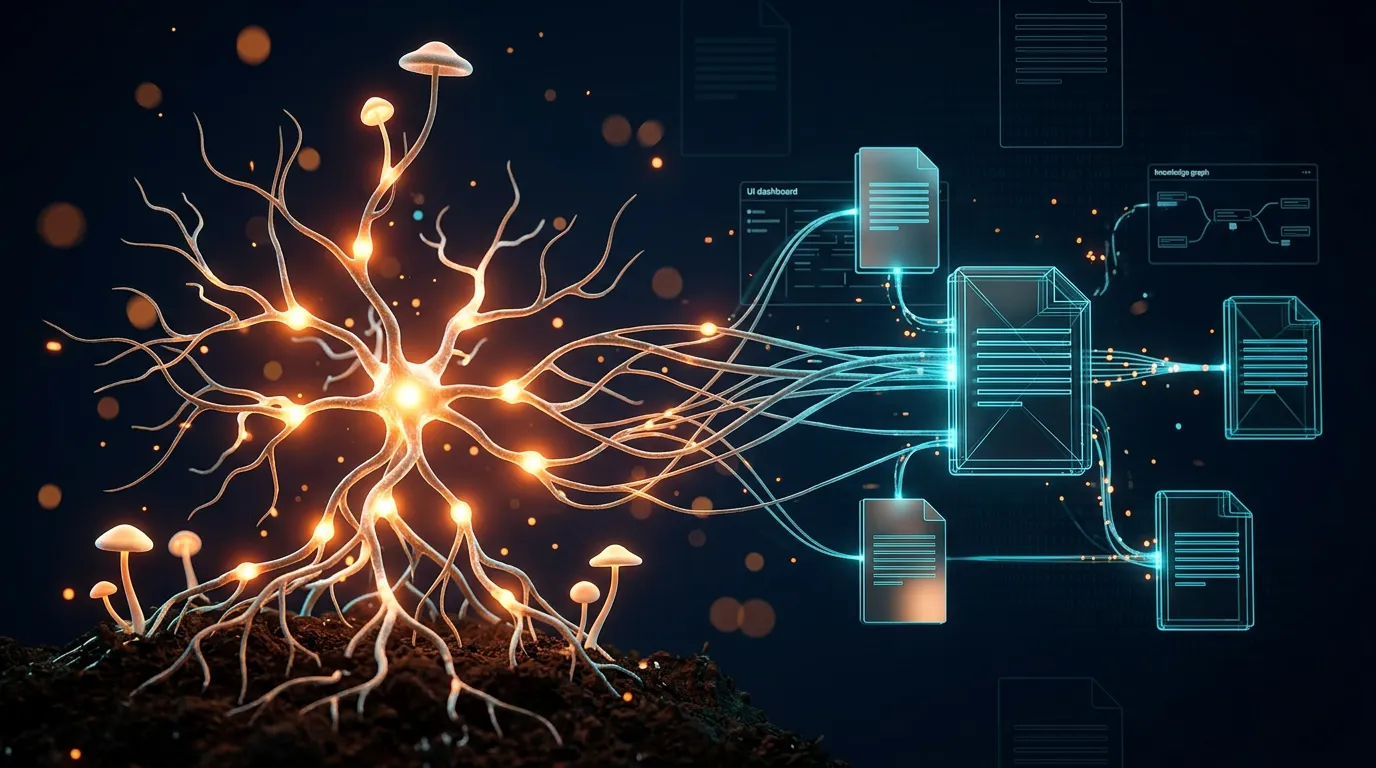 Unsichtbare Infrastruktur. Der größte Teil eines Myzels liegt unter der Erde. Das Wertvollste am Wiki ist nicht die einzelne Zusammenfassung, die ich oben sehe. Es ist das Netz aus Querverweisen, Widersprüchen zwischen Quellen und offenen Fragen dazwischen. Die Fruchtkörper - Synthesen, Concept-Pages - sind nur die sichtbare Spitze.